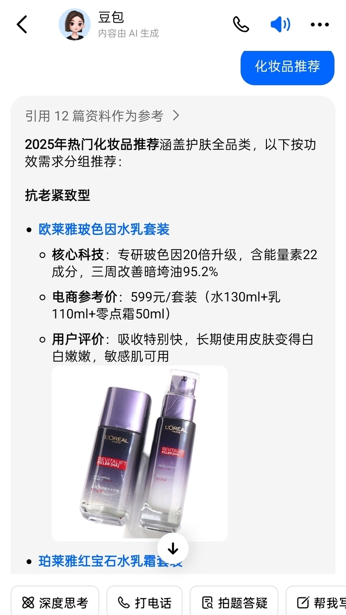 此外,记者还测试了非冬装类商品的推荐功能,输入 “宝宝玩具推荐”,豆包很快推荐了 “0-3个月:感官启蒙期”“4-6个月:手部探索期”“7-9个月:坐爬探索期”“10-12个月:站立学步期”四个不同阶段的玩具,每类均标注产品特色、发育锻炼及电商参考价;输入“化妆品推荐”,则按照功效需求推荐了“抗老紧致型”“保湿修护型”“清洁护理型”等,点击蓝色字体也能顺利跳转至抖音商城完成查看与下单,支付流程和支付方式都与常规抖音购物一致。