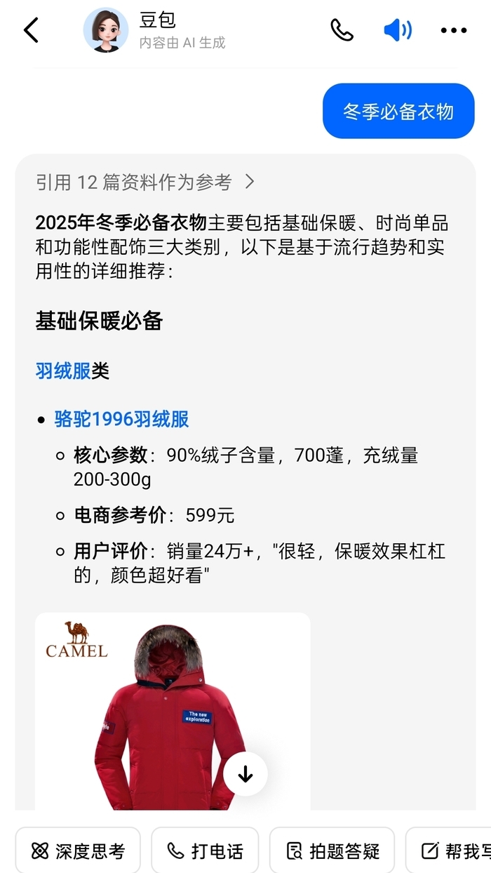 “原本只想让豆包推荐保暖穿搭,没想到直接通过豆包买到了心仪的秋裤!”近日,济南市民王女士向新黄河记者展示手机记录:在手机豆包APP上输入“冬天衣服推荐”后,界面迅速生成按“羽绒服”“毛衣”“加绒牛仔裤”“雪地靴”分类的清单,每项均附材质说明、设计亮点及参考价格。