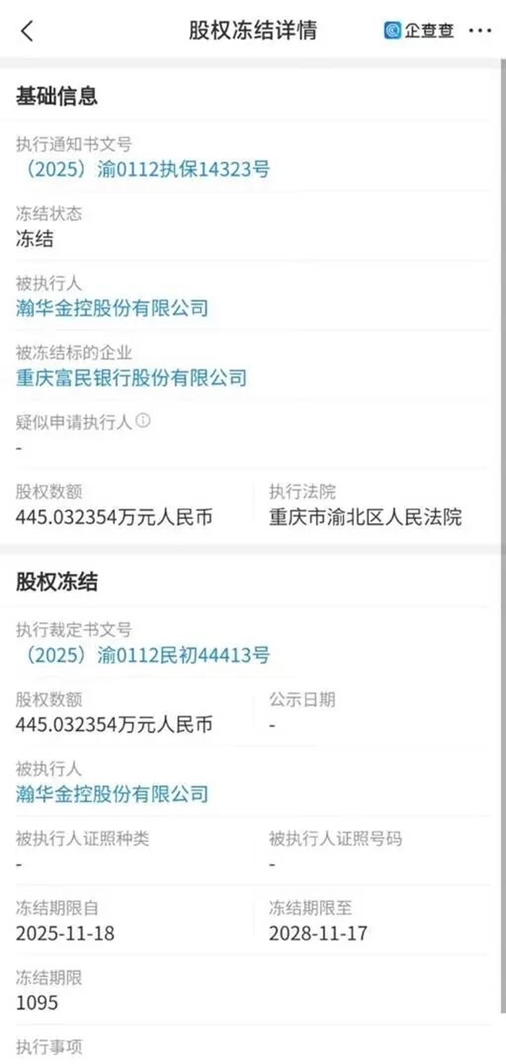 本次被冻结股权数额为445.032354万元,为富民银行第一大股东瀚华金控股份有限公司(本文称“瀚华金控”)所持有。执行法院重庆市渝北区人民法院,冻结期限自2025年11月18日至2028年11月17日。