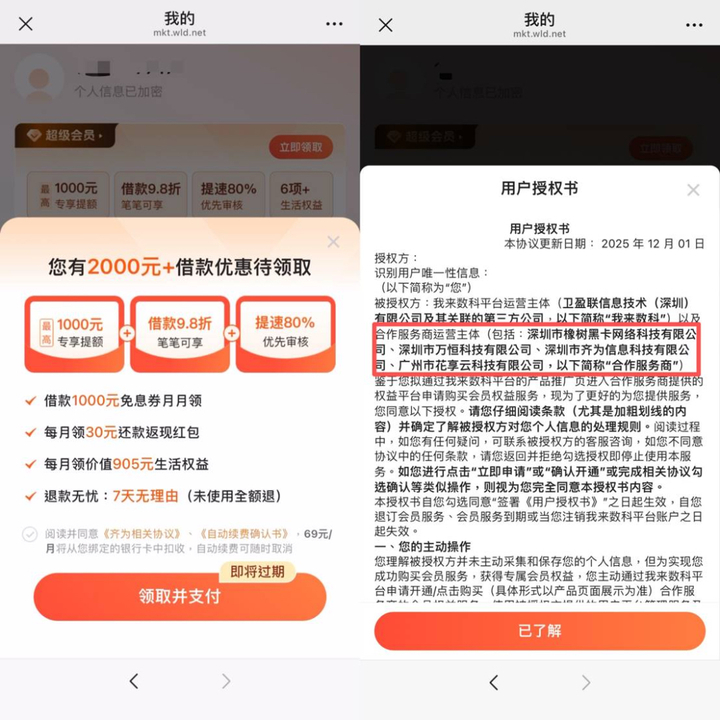 黑猫投诉平台中,有多名消费者对我来数科平台扣费问题进行投诉,其中一名消费者称,2025年10月30日在我来数科APP借款14000元,点击借款页面,会员广告字体过小,且位置隐蔽,误导其购买了822元的会员权益,并且还需要每月额外支付69元的超级会员才有效。