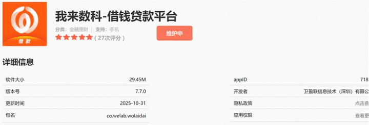 公开信息显示,我来数科为WeLab汇立集团旗下的借钱贷款平台,开发者为卫盈联信息技术(深圳)有限公司(以下简称“卫盈联信息”)。小米应用商店官网显示,该App目前正在维护中。微信官方服务账号“我来数科”目前尚可正常注册登录。