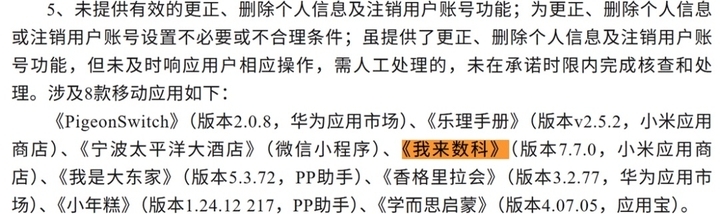 12月4日,国家计算机病毒应急处理中心通报了一批违法违规收集使用个人信息的移动应用,其中,“我来数科”因存在未提供有效的更正、删除个人信息及注销用户账号功能等被点名。