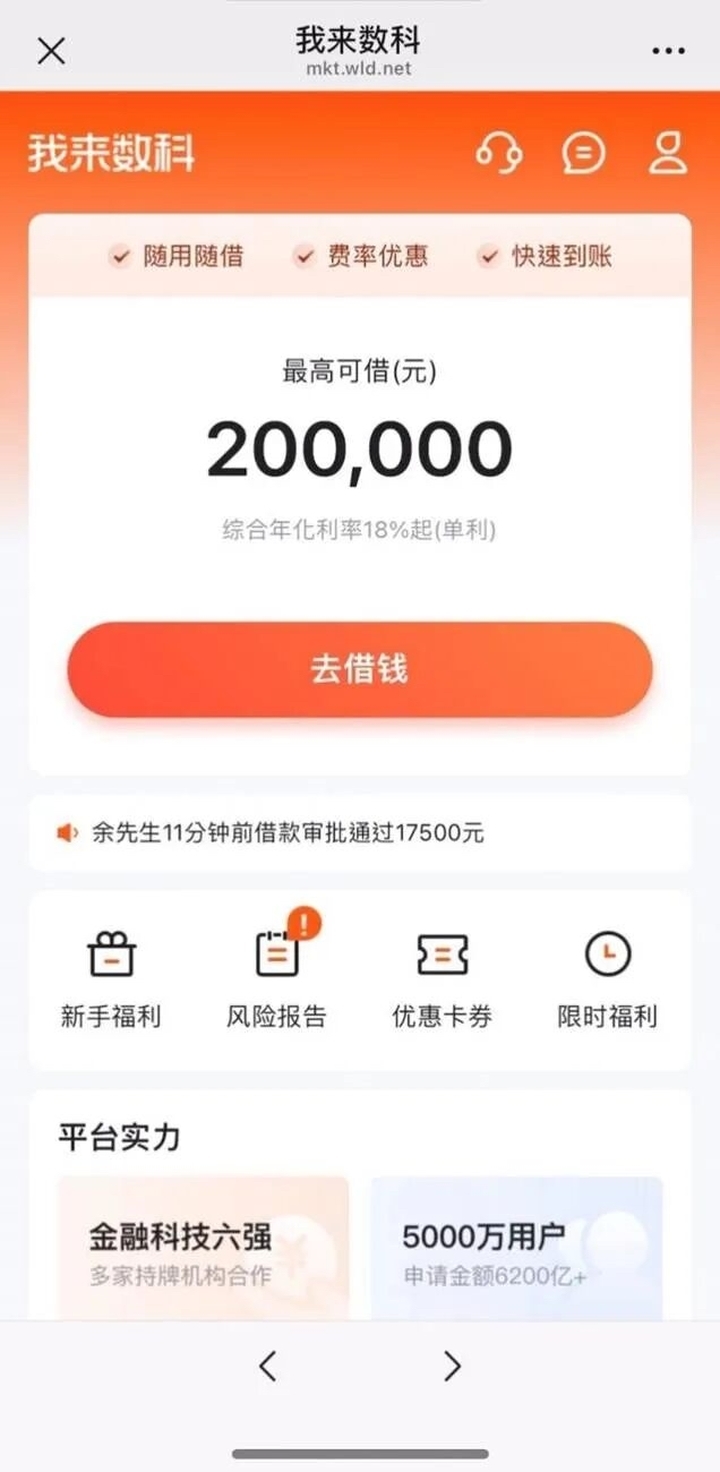 我来数科借款页面显示,其综合年化利率18%起(单利)。除了借款业务,目前该平台还可向用户提供会员权益、风险报告等服务。