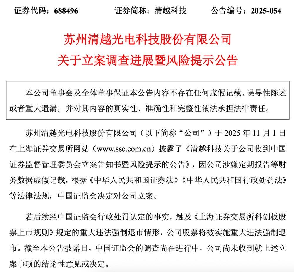 2025年11月1日,清越科技首次披露收到证监会《立案告知书》(编号:证监立案字0382025011号),理由为“涉嫌定期报告等财务数据虚假记载”。若最终认定构成重大违法,公司股票可能被实施强制退市。目前公司称经营管理、业务及财务状况正常,并承诺每月披露一次调查进展。
