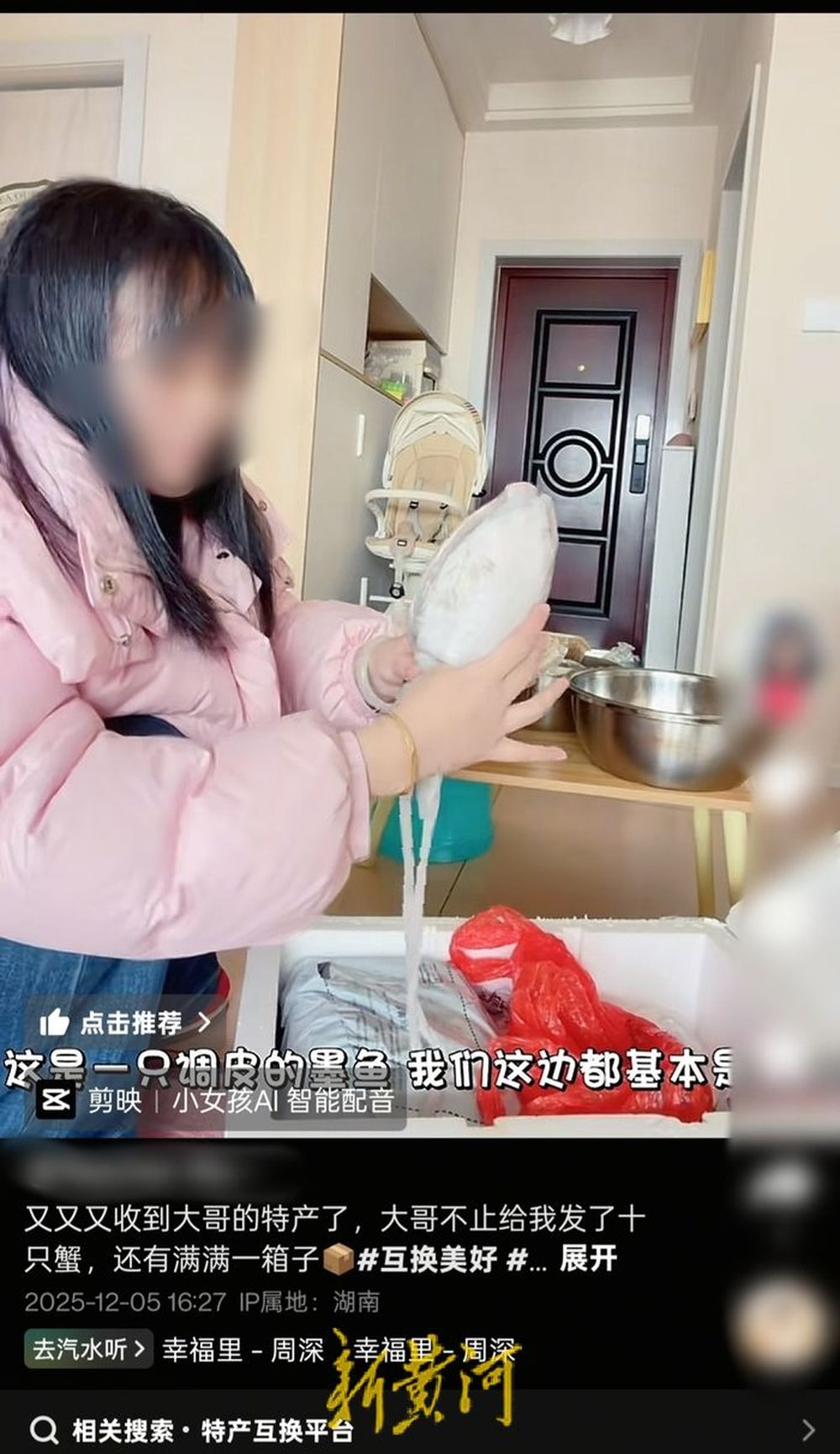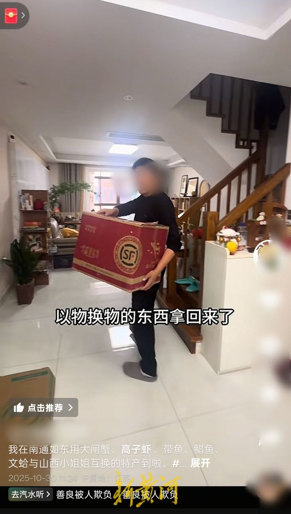 36岁的沈志(化名)家住江苏南通如东县,这个主业承包工程的南方小老板,生活平静幸福,平时也爱发发抖音。今年10月份,他在抖音上偶然刷到一个热点视频,是一名同城博主用大闸蟹和陌生网友交换特产。