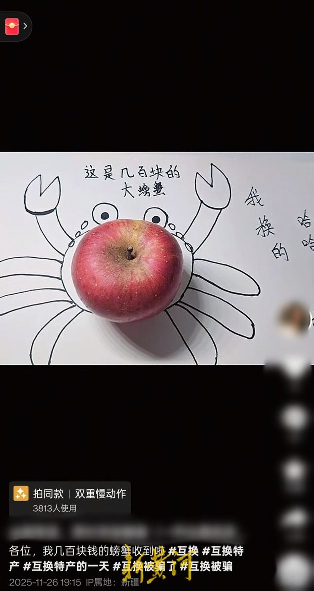 “当时第一反应是挺生气的,但是气完了之后,看着那苹果,我就笑了。”这一次,小蔡没有报警,而是顺手画了一只螃蟹,苹果就摆在螃蟹中。她把这张画分享到抖音号上自嘲,“想着小千块钱算了,最起码他给我回了一个苹果,就这样吧。”
