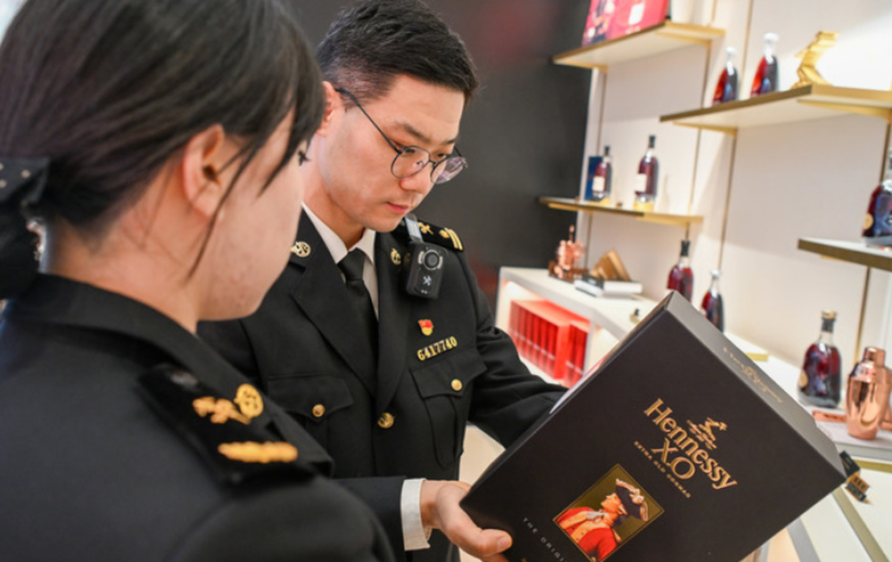 12月18日,海口海关所属海口港海关关员在海口国际免税城巡店。新华社发