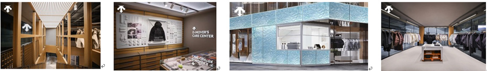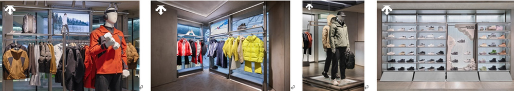 该区域集中呈现迪桑特 ALLTERRAIN 系列产品。陈列系统采用可移动、可拆解、可组合的模块化设计,打破传统货架的固定边界,使服装以更开放的方式被观看与理解,也为消费者提供更具探索感的浏览路径。空间内同步设置 D-Mover’s Care Center,为行动家提供专业洗护与维修等服务。通过将护理服务纳入同一空间体系,迪桑特进一步延展其专业支持能力,使品牌关注点从装备本身延展至产品在整个使用周期中的表现与维护,品牌角色由此从“装备提供者”深化为“运动生活方式支持者”。同时,在这个空间中品牌也为来访者呈现了第一个迪桑特品牌咖啡空间 –“DESCENTE Café“,旨在为消费者在未来之城的空间中带来更多的增值体验。