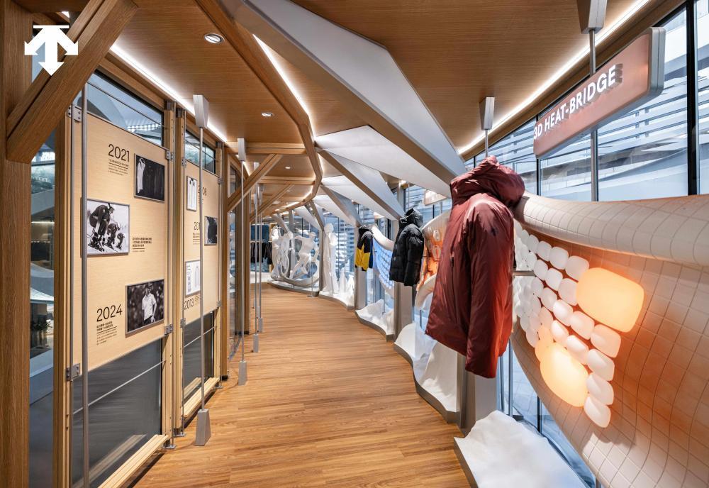 连接“专精之域”与下一主题空间的连廊,集中了品牌多年来的技术积累。中部设置莫比乌斯环装置,其上呈现滑雪、铁人三项、高尔夫与跑步等多项运动形象,直观展示品牌在三大专业运动及多场景训练领域的体系化布局。连廊一侧展示 HEAT NAVI®、3D 保温系统、SCHEMATECH 等核心服装科技,另一侧则呈现品牌发展过程中的重要里程碑节点。通过材料、结构与图文信息的组合呈现,品牌多年在功能创新与产品研发层面的积累得以清晰展示。