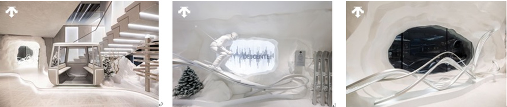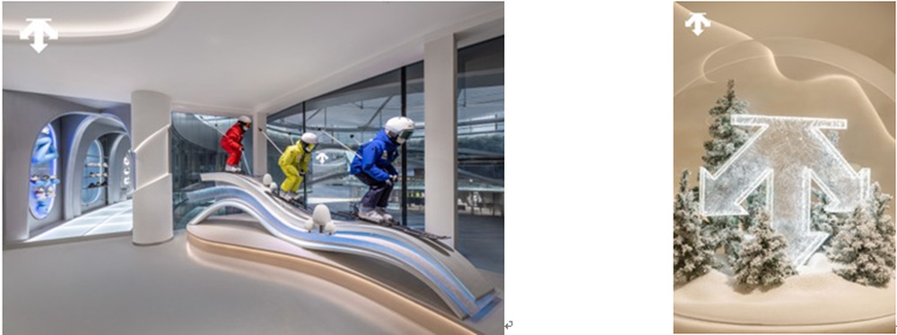 “专精之域”空间作为“未来之城”动线中的起始区域呈现,该区域以滑雪为线索,围绕迪桑特“一切始于滑雪”的品牌基因展开,通过五大山峰意象呈现品牌发展进程中的重要专业节点,并结合雪洞结构、雪山缆车装置与雪山指示牌等场景化展示,构建出具有辨识度的冰雪语境。