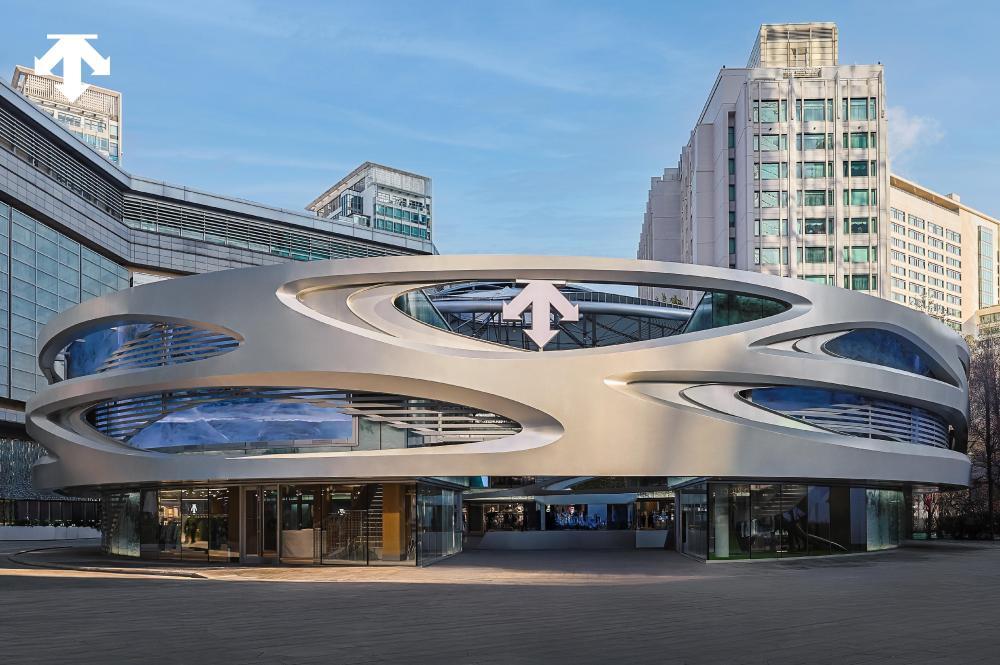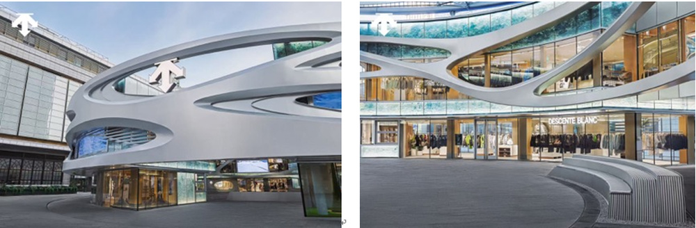 迪桑特“未来之城”的核心,源自一个永恒的几何概念——莫比乌斯环。整个空间以此为设计母体,结合“一切始于滑雪”的品牌基因,如同无限延展的雪道,形成了不断向前延伸、周行不殆的视觉体验。这不仅是空间的物理形态,更是迪桑特品牌精神的建筑化表达:四座主题建筑通过构思精妙的连廊有机串联,滑雪、高尔夫、全地形都市机能与儿童世界的场景在此交融,象征着品牌对专业运动生态的完整构建与融会贯通。整体动线设计超越传统零售逻辑,引导来访者经历从探索、钻研、沉淀到启迪的完整叙事循环。每一次来访,都是来访者与品牌运动理念的一次全新对话。