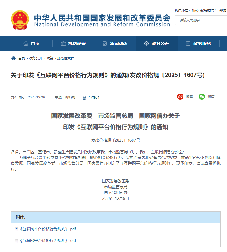 为健全互联网平台常态化价格监管机制,规范相关价格行为,保护消费者和经营者合法权益,推动平台经济创新和健康发展,国家发展改革委、市场监管总局、国家网信办制定了《互联网平台价格行为规则》。现予印发,请认真贯彻执行。