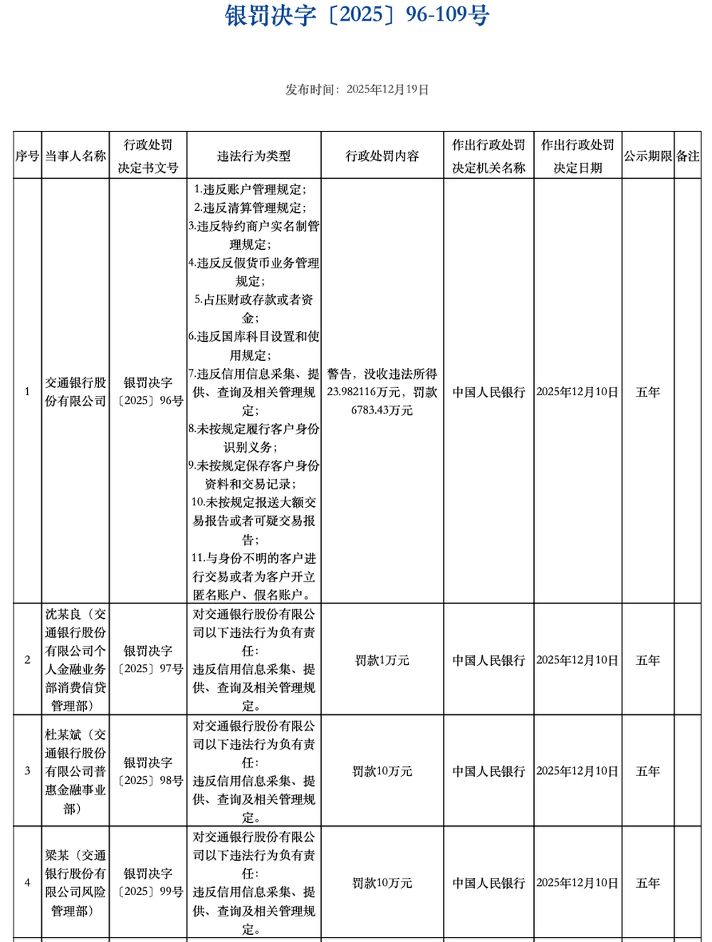 12月19日,中国人民银行官网发布两份行政处罚公告,对交通银行股份有限公司与中国工商银行股份有限公司开出合计超过1.1亿元的罚没决定,并同步追究30名相关责任人的个人责任。公告显示,交通银行被警告、没收违法所得23.982116万元,并处罚款6783.43万元;工商银行被警告、没收违法所得434.570857万元,并处罚款3961.5万元。两项合计罚没金额达1.1243亿元。所有处罚决定均于2025年12月10日作出,公示期为五年。