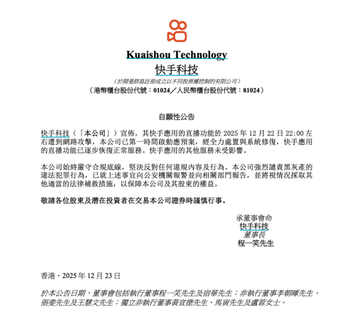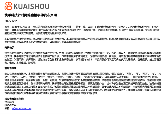 根据公告,2025年12月22日22:00左右,快手应用的直播功能遭到网络攻击。公司启动应急预案进行处置与系统修复。快手表示,目前直播功能已逐步恢复正常服务,应用内的其他服务未受影响。