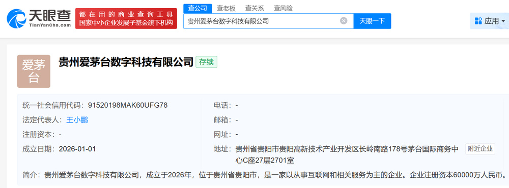 天眼查显示,贵州爱茅台数字科技有限公司已于2026年1月1日注册成立,注册资本6亿元,法定代表人、董事长为王小鹏,注册地位于贵阳市贵阳高新技术产业开发区,是一家以从事互联网和相关服务为主的企业。