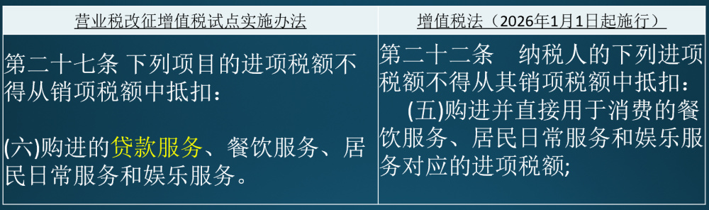 尽管法律并未直接明确贷款服务可抵扣,但删除禁止性条款的立法安排,打破了长期以来贷款服务抵扣的制度壁垒,为后续政策优化留下了充足的制度空间。