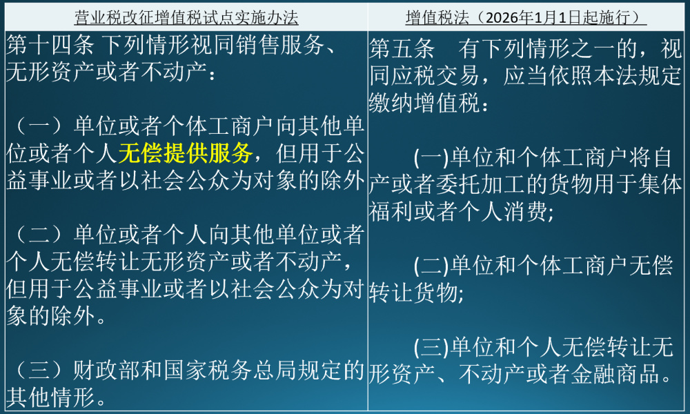 这是新增值税法施行带来的重要利好。旧规则下,集团内企业虽可享受2027年底前免税政策,但非集团企业无偿拆借需视同销售征收增值税;新规则下,《增值税法》第五条重新界定了视同应税交易的范围,删除了“单位或者个体工商户向其他单位或者个人无偿提供服务”的视同销售规定,仅保留了无偿转让货物、无形资产、不动产或者金融商品的视同应税交易情形。
