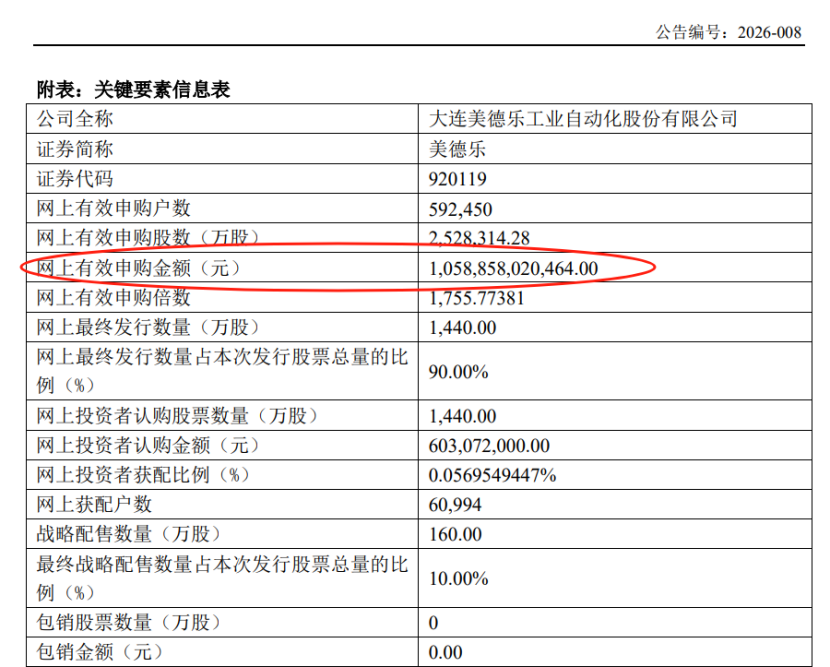 美德乐的发行结果显示,网上有效申购户数59.25万人,有效申购金额10588.6亿元,中签户数约6.1万,网上获配股数1440万股。美德乐的网上发行价为41.88元。