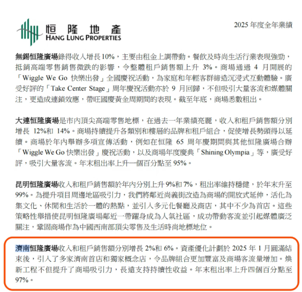 对于济南恒隆广场2025年全年的业绩,公司在业绩公告中表示,“济南恒隆广场收入和租户销售额分别增长2%和6%。资产优化计划于2025年1月圆满结束后,引入了多家济南首店和独家概念店,令品牌组合更加丰富及商场客流量增加。新工程不但提升了商场吸引力,长远支持持续性收益。年末租出率上升四个百分点至97%。”