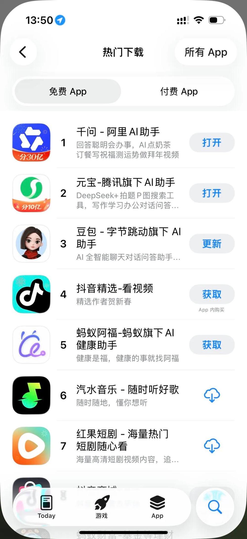 2月6日消息,今日千问开启免单奶茶活动后,已于中午登顶苹果App Store免费应用榜。第二名为元宝,第三名为豆包。