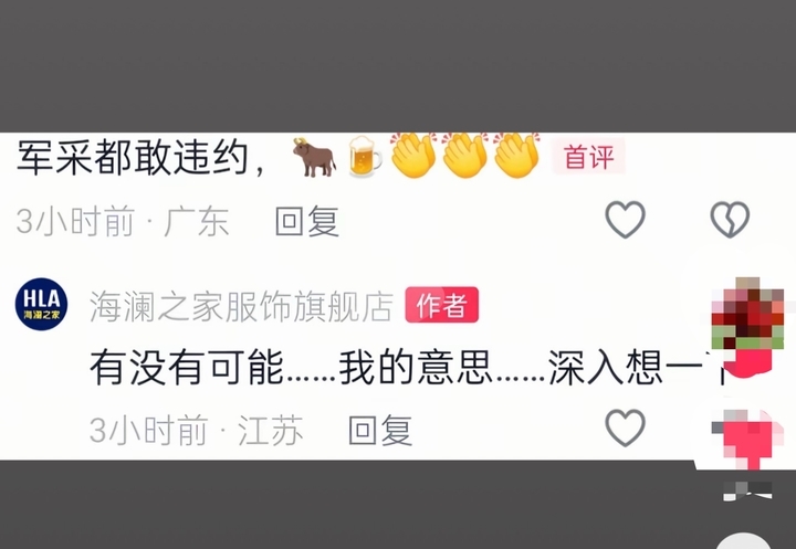 此外,记者还发现,有网友在社交平台发布一张疑似海澜之家服饰旗舰店回应的截图,内容为“有没有可能......我的意思......深入想一下。”对于上述评论,记者询问该店铺客服,客服并未作出回答。