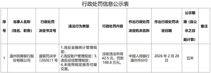 近日,中国人民银行浙江省分行官网显示,温州民商银行因违反金融统计管理规定、违反账户管理规定、违反征信管理规定、未按照规定报告可疑交易共四项违法行为被没收违法所得42.5元,并被罚款188.8万元。