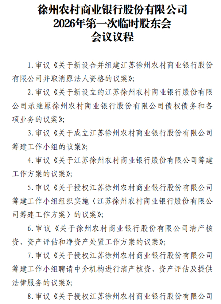 近日,徐州农商银行、新沂农商银行、丰县农商银行、睢宁农商银行、邳州农商银行、沛县农商银行等6家徐州地区的农商银行均发布临时股东会公告,宣布召开徐州农村商业银行股份有限公司2026年第一次临时股东会,审议《关于新设合并组建江苏徐州农村商业银行股份有限公司并取消原法人资格的议案》等多项议案。
