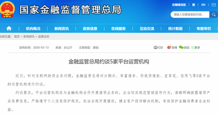 3月13日,根据国家金融监督管理总局官网发布,近日,针对互联网助贷业务问题,金融监管总局对分期乐、奇富借条、你我贷借款、宜享花、信用飞等5家平台的运营机构进行约谈。