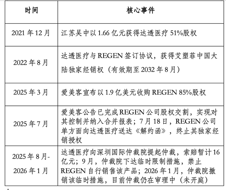 比业绩下滑更致命的,是一桩金额高达16亿元的涉外仲裁,涉案金额已接近公司2025年全年净利润,一旦败诉,将对现金流与盈利能力造成打击。纠纷根源在于AestheFill(艾塑菲)童颜针的独家代理权之争,时间轴如下: