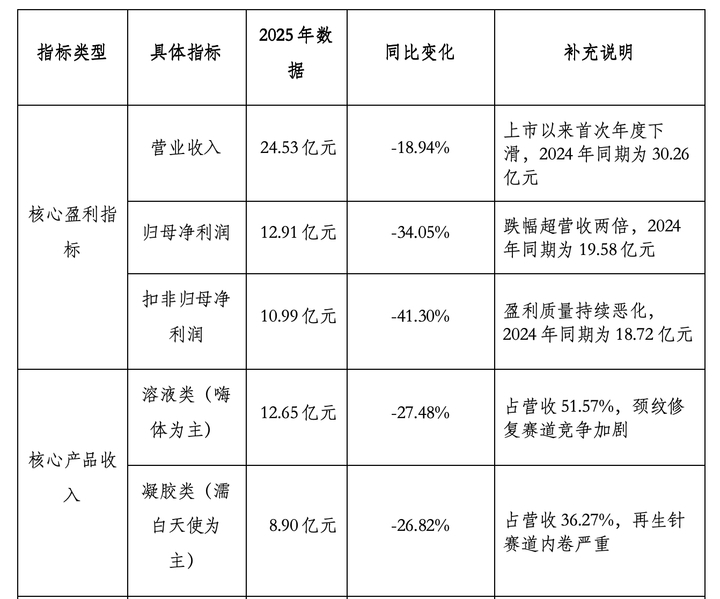 2026年3月,爱美客(300896.SZ)交出上市以来最差成绩单:2025年全年营收24.53亿元,同比下降18.94%;归母净利润12.91亿元,同比下滑34.05%——这是公司2020年上市以来首次年度业绩“双降”,也是近十年首次营利双跌。更令市场不安的是,这并非短期波动:据财报测算,2025年四个季度单季营收同比均为负增长(Q1降17.9%、Q2降25.1%、Q3降21.3%、Q4降9.5%)。
