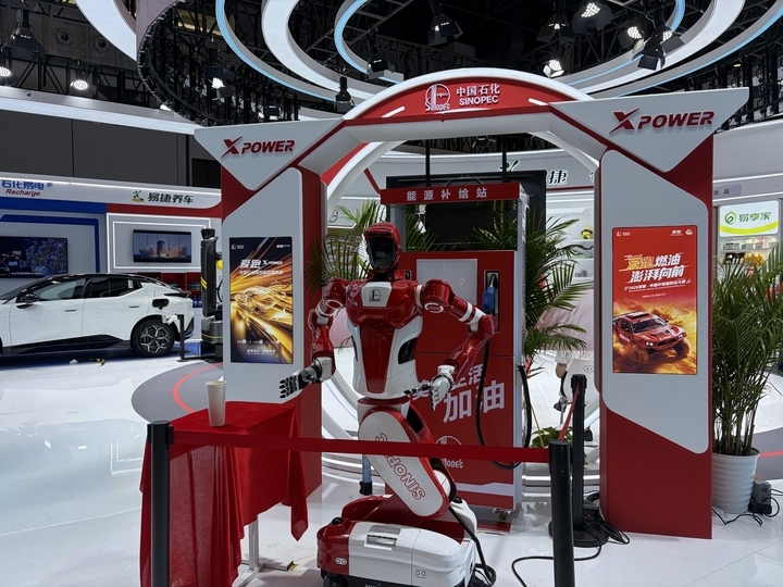 在中石化展区,身高187厘米的“加油侠”是全场焦点之一。它不再像去年的多数机器人展品那样只会原地摆手作揖,而是被设定为一个能精准完成开关油箱盖、抓取油枪加油、挂枪等一系列动作的“全能员工”。在它旁边,一台智能充电机器人演示着如何在20秒内完成精准插接入位。