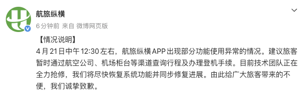 4月21日下午,@航旅纵横 发布情况说明:4月21日中午12:30左右,航旅纵横App出现部分功能使用异常的情况。建议旅客暂时通过航空公司、机场柜台等渠道查询行程及办理登机手续。目前技术团队正在全力抢修,我们将尽快恢复系统功能并同步修复进展。由此给广大旅客带来的不便,我们诚挚致歉。