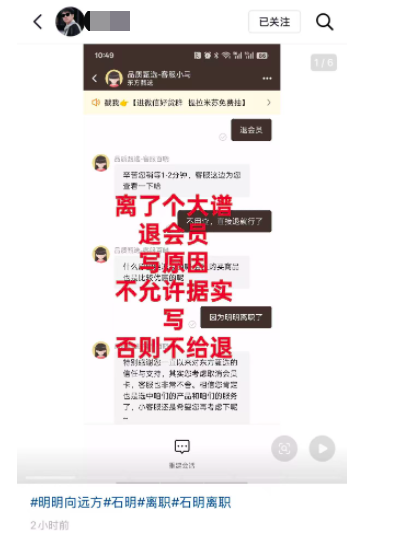有用户在社交平台贴出退订截图并带上主播石明离职标签 图片来自抖音App