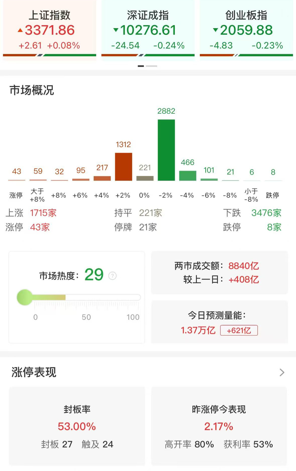 截至午间收盘,沪指微涨0.08%报3371.86点,深证成指跌0.24%,创业板指跌0.23%,沪深北三市合计成交9073亿元。