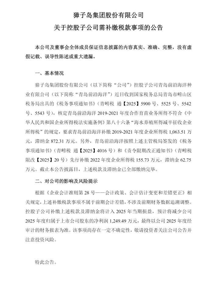 10月16日早间,獐子岛集团股份有限公司(002069.SZ)在巨潮资讯网发布公告称,其控股子公司青岛前沿海洋种业有限公司收到国家税务总局青岛市崂山区税务局出具的相关通知书,核定其2019—2021年度合作育苗业务所得不符合“海水养殖所得减半征收企业所得税”规定,需补缴企业所得税1063.51万元,滞纳金872.31万元。同时,该子公司已先行补缴2022年度企业所得税155.73万元,滞纳金62.75万元,上述税款及滞纳金均已全部缴纳完毕。