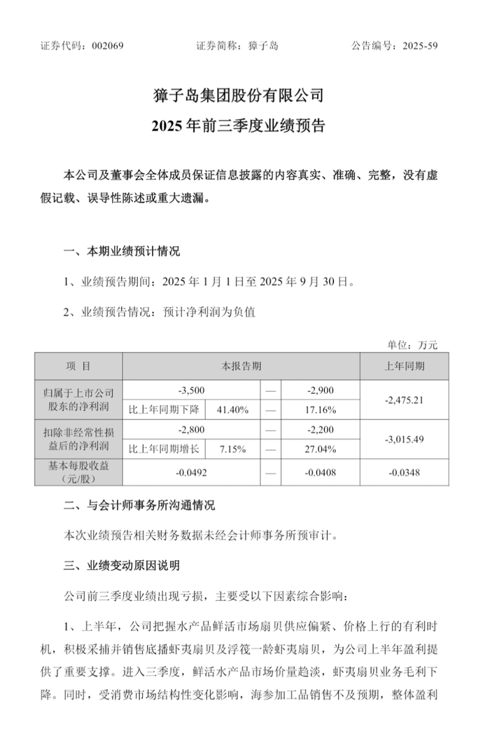 而此次子公司补缴税款事件,正值獐子岛业绩本就不佳之时。公司同时发布的业绩预告显示,预计2025年前三季度归属净利润亏损2900万元至3500万元。除了子公司补缴税款及滞纳金这一因素外,鲜活水产品市场价量趋淡,海参加工品销售不及预期,部分资产计提减值准备等,也是导致其业绩亏损的重要原因。