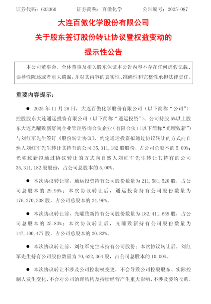 根据公告,刘红军与大连通运投资有限公司、大连光曜致新舒鸿企业管理咨询合伙企业(有限合伙)于2025年11月26日签订《股份转让协议》,后两者分别向刘红军转让其持有的3531.12万股百傲化学股份,各占上市公司总股本的5%,合计转让7062.24万股,占总股本的10%。转让价格以协议签订日百傲化学股票收盘价的90%确定,为每股28.116元。