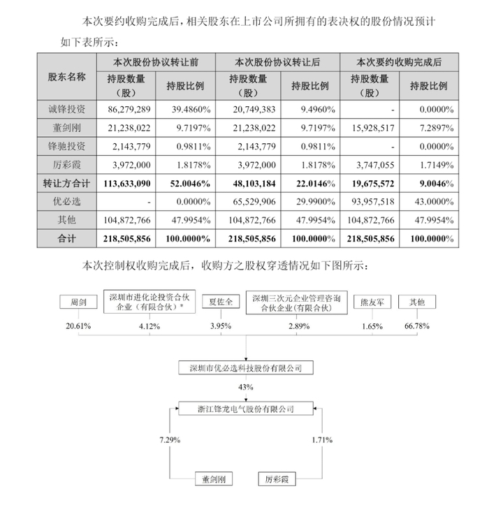 完成收购后,优必选将拥有不少于9395.7518股A股(约占锋龙股份已发行股本的43%),成为锋龙股份的控股股东,实控人也将由锋龙股份董事长董剑刚变更为优必选创始人周剑。