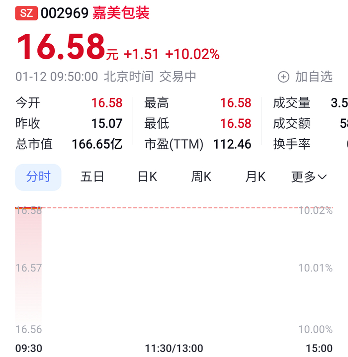 当天,嘉美包装开盘涨停,报16.58元,此前收盘价为15.07元,总市值也从151.47亿元涨至166.65亿元。