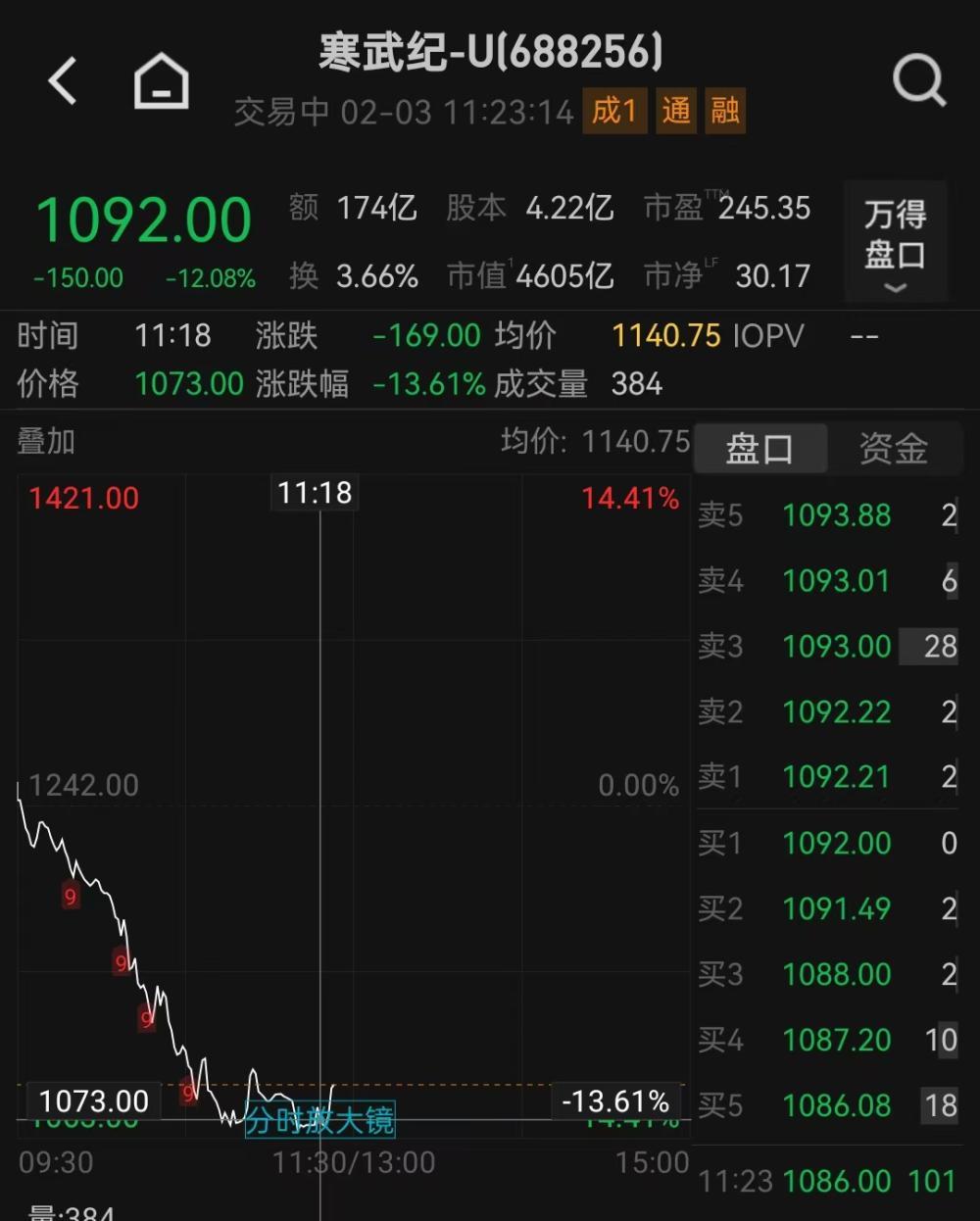 上周五晚间发布2025年业绩预告后,寒武纪(688256.SH)股价本周一下跌,今日盘中又跌超13%,市值回落到4600亿元以下。
