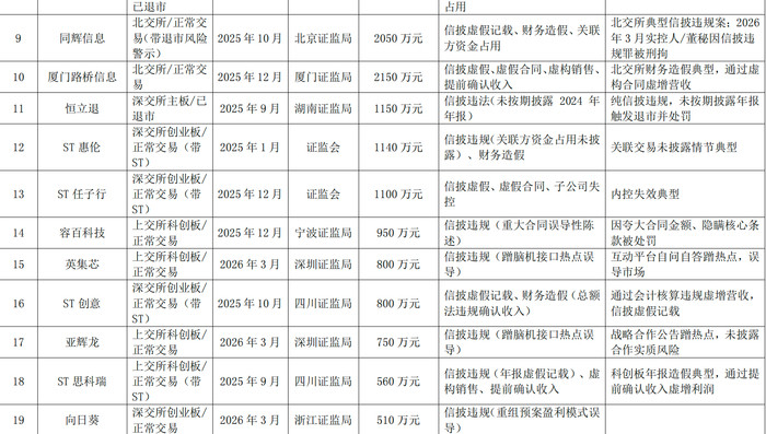 执法力度同样延伸至中介机构。天风证券因未披露93亿元的关联融资事项,被罚5980万元,3名责任人被终身禁入,并在2026年2月再次因新问题被立案调查。鸿达兴业则因未披露募集资金用途及虚增40.78亿元收入和利润,被罚5680万元;ST惠伦和*ST苏吴等公司亦因资金占用未披露或虚增收入问题受到千万元级别的处罚。