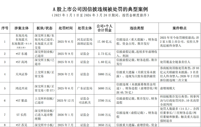 在这一系列案件中,上亿级罚单已不再罕见。*ST东通因连续多年虚增收入和利润,被罚2.73亿元;*ST高鸿因欺诈发行及财务造假,被罚1.60亿元,相关责任人也被追责。