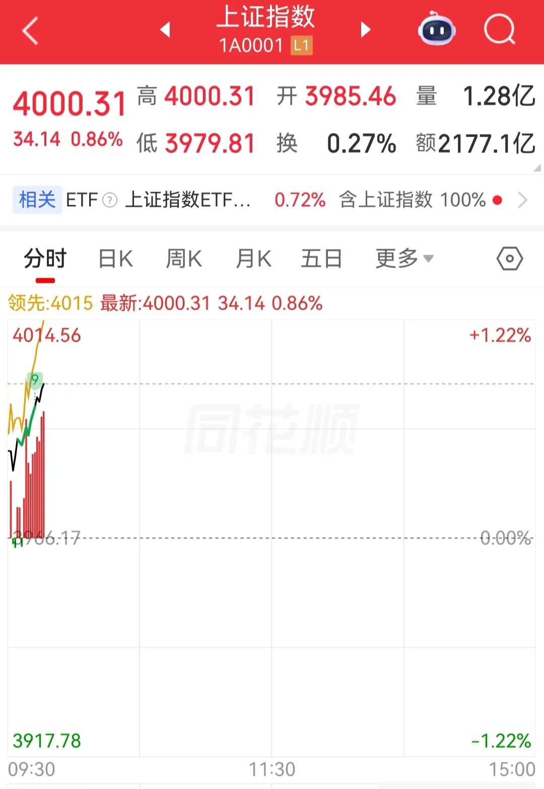 4月10日,沪指盘中涨0.86%,报4000.31点。