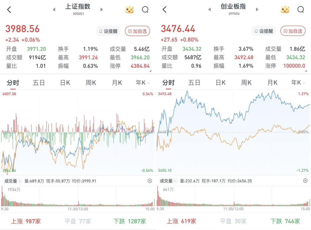 至收盘,上证综指涨0.06%,报3988.56点;深证成指涨0.69%,报14407.86点;创业板指涨0.8%,报3476.44点。