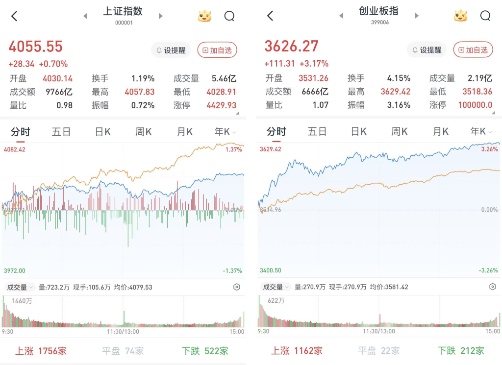 至收盘,上证综指涨0.7%,报4055.55点;深证成指涨2.05%,报14796.33点;创业板指涨3.17%,报3626.27点。