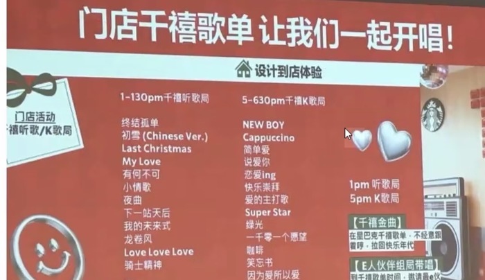 11月11日,星巴克中国方面回应新黄河记者表示,在11月4日—17日,每天下午1-3点及5-7点,全国星巴克门店会播放“千禧金曲”限定歌单,记者查询发现,该歌单包括众多大众熟悉的中文歌曲,如《快乐崇拜》《爱在西元前》以及《欧若拉》等。“我们希望借由经典的音乐,与顾客一同重温分享千禧年以来的美好回忆。”
