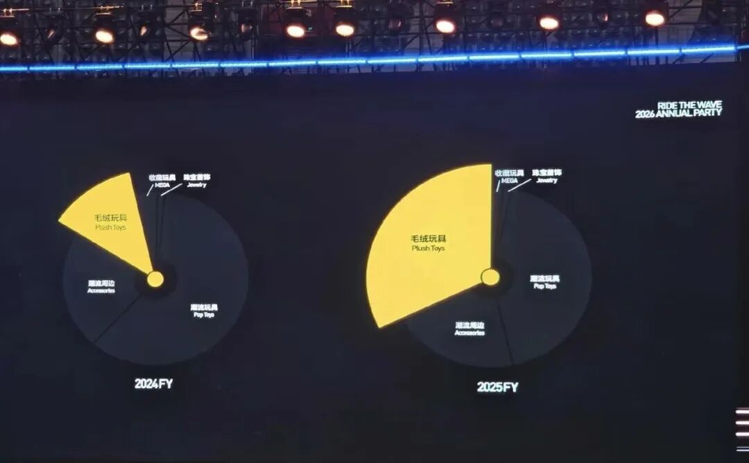 年会上还总结了泡泡玛特过去一年的年度数据,全球员工伙伴超1万人、注册会员超 1 亿人、LABUBU 全年销量超 1 亿只、全品类全 IP 产品销量超4亿只,业务覆盖 100+国家和地区、全球门店超700家、拥有6大供应链基地并赋能超20万个就业岗位,同时对比2024财年与2025财年的饼图显示代表泡泡玛特的黄色板块明显扩大,核心品牌或自有IP营收占比显著提升,整体展现了其全球化扩张、IP 运营成果、供应链能力及核心业务的持续增长态势。