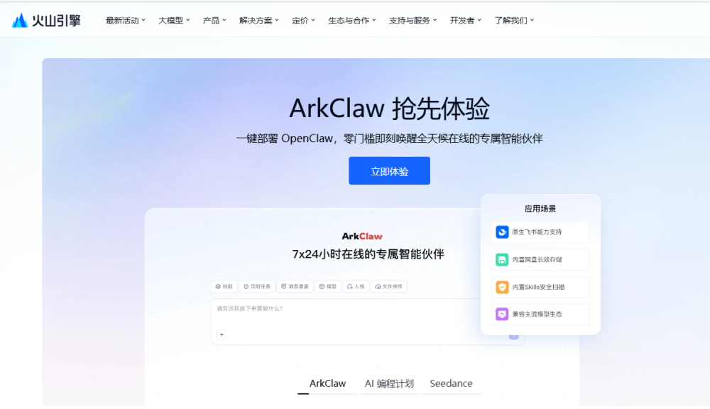 字节跳动旗下火山引擎同日上线了ArkClaw——一款开箱即用的云上SaaS版OpenClaw。ArkClaw无需任何复杂配置,打开网页即可使用,7×24小时在线。除了在网页端进行交互,ArkClaw已支持多种主流即时通讯App,并深度适配飞书OpenClaw官方插件。