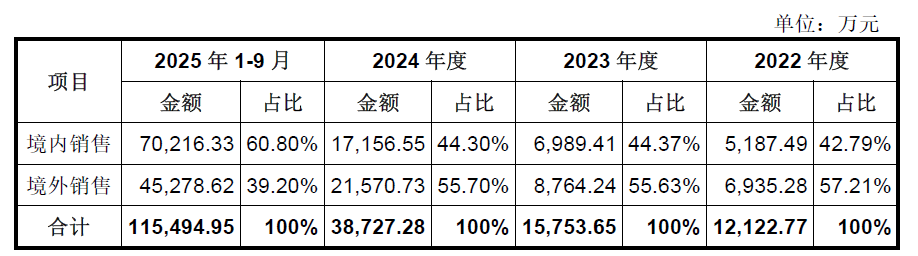 根据招股书申报稿,宇树2022年至2025年1-9月境外主营业务收入金额分别为6935.28万元、8764.24万元、21570.73万元及45278.62万元,占主营业务收入的比例分别为57.21%、55.63%、55.70%及39.20%。2025年1-9月,受益于境内收入规模的大幅提升,公司境外收入占比虽有所下降,但其销售金额及同比增幅仍实现了较好增长,占公司主营业务收入比例仍在35%以上。公司境外销售结算货币以美元为主。