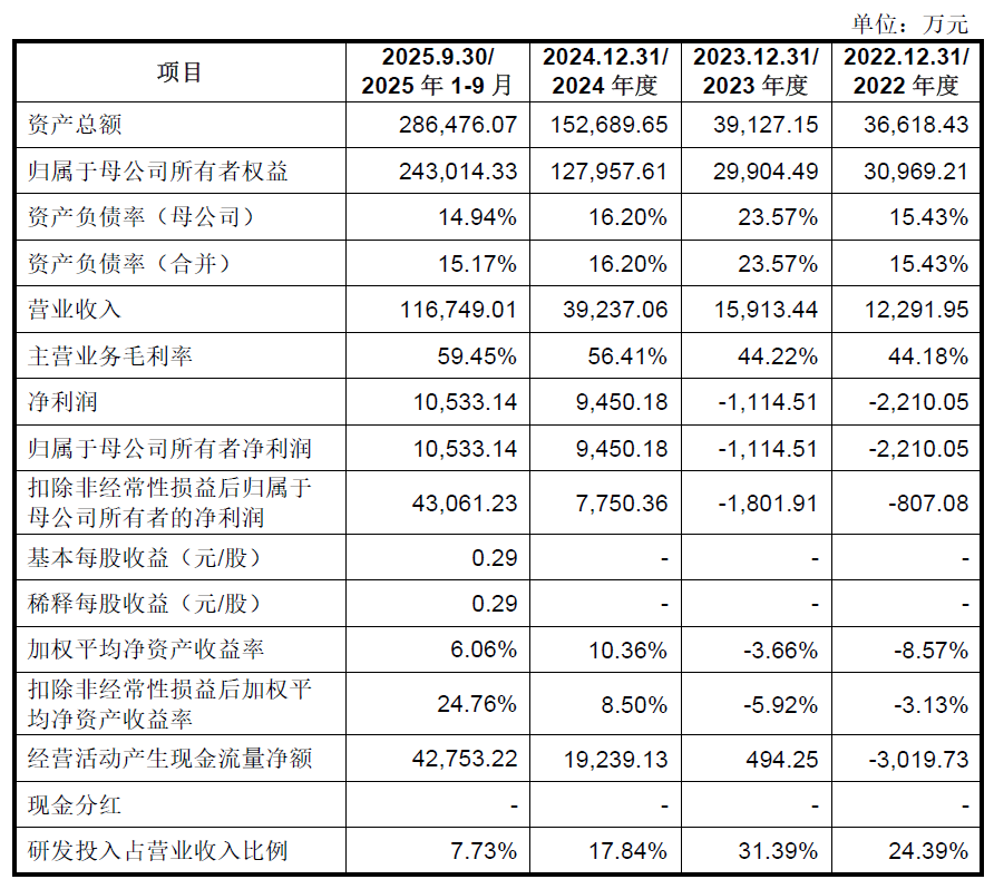根据招股书申报稿,2023年至2025年,宇树科技营业收入分别为15913.44万元、39237.06万元、170820.87万元,净利润分别为-1114.51万元、9450.18万元、2.88亿元。主营业务的毛利率从2022年的44.18%提升至2025年1-9月的59.45%。